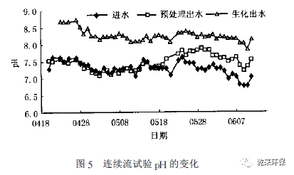 2. 4. 3 預處理工藝對p~ 的影響:從圖5 可以看出,生化出水的p~ 有所提高,但相對傳統的鐵碳法來說,提高的幅度不很大。在預處理過程中,Fe 被氧化成Fe2 + 。在生化段好氧曝氣的過程中,分子態(tài)的氧繼續(xù)氧化Fe2 + ,p ~得到提高?;瘜W反應如下:4Fe2+ + O2 + H2O →4Fe3+ + 4OH-隨著Fe2 + 的氧化,pH升高。而pH的升高,又促使三價鐵沉淀: