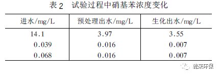由表1可見,該預處理工藝有較好的除磷效果,經生化處理后PO3 +4達到二級排放的水平。另外由表2 可見預處理對硝荃苯的去除也有很好的效果。