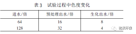 2. 4. 5 預處理對鐵和色度的去除:通常鐵鹽可以改善活性污泥的沉降性能。在本次試驗中發(fā)現,生物膜的固著性能大大提高,大量的生物膜固定在懸浮填料上,使曝氣池中幾乎無懸浮污泥,處理水清沏透明。經過曝氣池,Fe2 + 被氧化成Fe3 + ,沉淀去除。試驗測得生化段出水總鐵離子濃度為3. 85—8. 55mg/L,滿足二級排放要求。催化鐵內電解法具有顯著的脫色效果(見表3 )。