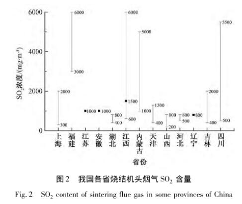 燒結機頭煙氣中SO2因燒結原料的配比、鋪料方式、燒結工況等因素影響,波動很大,不同地區(qū)原料不同,差異明顯。我國各地區(qū)燒結機頭煙氣中SO2含量見圖2。