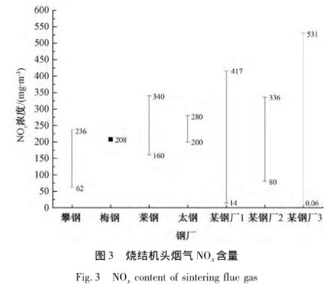 由燒結燃料(煤粉、焦粉)燃燒產(chǎn)生的燃料型NO,占燒結煙氣中NOx的90%以上。見圖3,我國燒結煙氣中NOx含量為100~500mg/m3,波動較大。目前,燒結煙氣脫硝主要以活性炭/焦吸附為主。