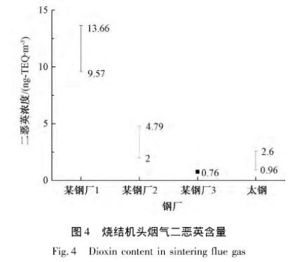 燒結過程中的二惡英主要由“從頭合成”途徑生成。燒結原料中含有的Fe、Cu、Cl等元素提供了催化劑和氯源;燃料的不充分燃燒提供了大分子碳源;燒結過程漏風率高,含氧充足,在250~450℃,二惡英的“從頭合成”得以發(fā)生。目前國內(nèi)關于燒結煙氣中二惡英含量的報道較少,如圖4所示,不同燒結煙氣的二惡英排放量差別很大,可能跟原料與工況有關。