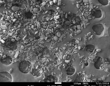 根據(jù)化學(xué)分析結(jié)果可見,除霧器上的垢物與石膏的組成較為接近,主要成分均為CaS04˙2H20。結(jié)合除霧器的工作機(jī)理,可以認(rèn)為除霧器的垢物與石膏的來源均為脫硫漿液所攜帶的固體顆粒物。但是掃描電鏡微觀顯示其晶體形態(tài)完全不同,除霧器垢物是顆粒與片狀晶體的混合物,而脫硫石膏呈現(xiàn)出顆粒狀(或短柱狀)晶體結(jié)構(gòu)。