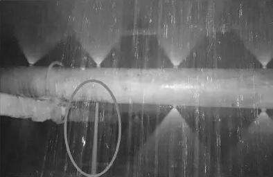 另外當(dāng)沖洗水含固量較高或存在異物時,也會造成噴嘴堵塞。在后續(xù)運行中,發(fā)生噴嘴堵塞的區(qū)域形成沖洗死角,除霧器葉片無法得到?jīng)_洗,極易結(jié)垢。另外還有部分沖洗水噴嘴脫落或沖洗水管斷裂,也會大大降低沖洗效果。如圖4所示,紅圈處的噴嘴脫落,沖洗水成柱狀下流,沖洗面積大大減小,所對應(yīng)的區(qū)域?qū)o法得到有效沖洗。此類故障在運行中難以發(fā)現(xiàn),需要每次停機(jī)時加強檢修,及時將脫落和堵塞的噴嘴進(jìn)行修復(fù)。