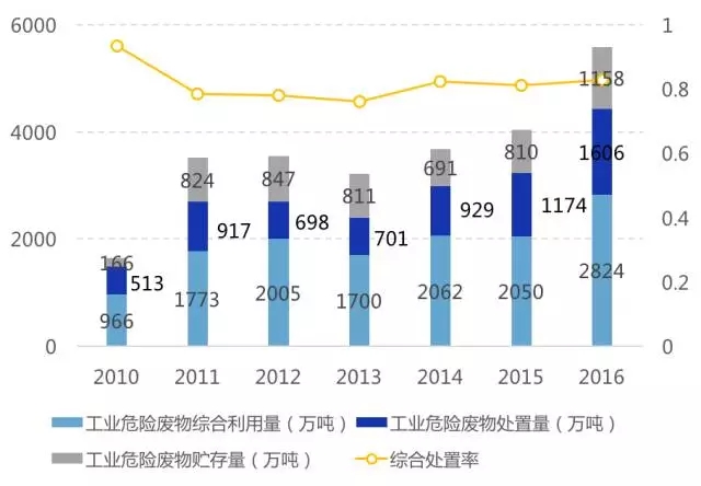 在環(huán)保監(jiān)管力度增強(qiáng),各省均推出省級(jí)督查方案背景下,危廢處置剛需再次提升,尤其是要求進(jìn)入規(guī)范渠道處置的量增加。但市場(chǎng)情況是,實(shí)際產(chǎn)生量遠(yuǎn)大于統(tǒng)計(jì)量(披露16年5347萬(wàn)噸,預(yù)計(jì)實(shí)際8000萬(wàn)噸),低綜合利用處置率(83%),低有效利用率(25%),導(dǎo)致整體危廢的處置供不應(yīng)求。