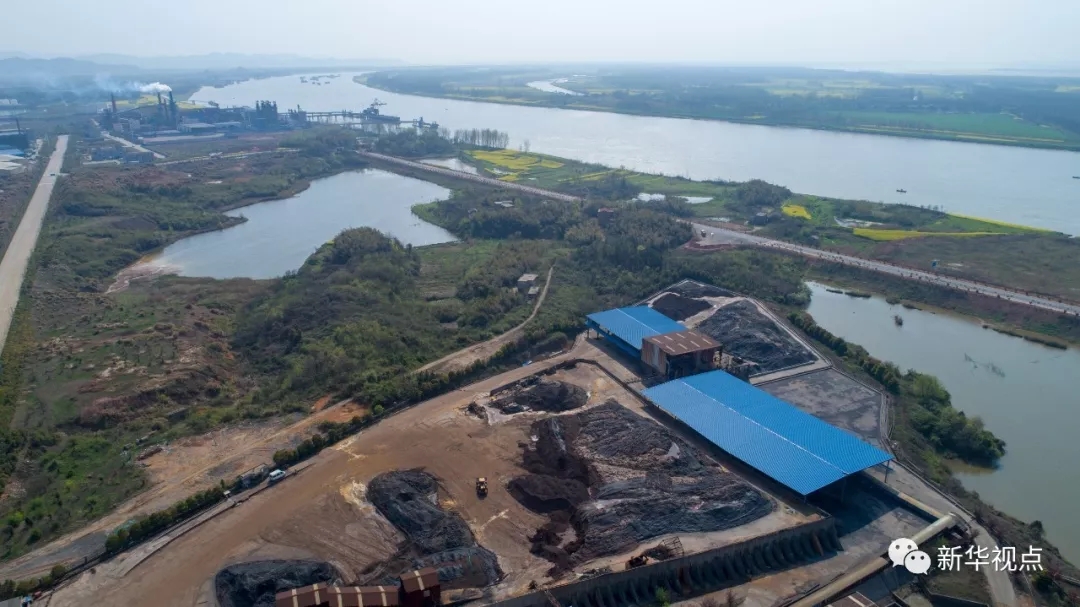 這是3月29日用無人機(jī)拍攝的安徽貴池前江工業(yè)園內(nèi)池州恒鑫材料科技有限公司廠區(qū)內(nèi)的長江堤岸旁傾倒的選礦尾渣。新華社記者 郭晨 攝