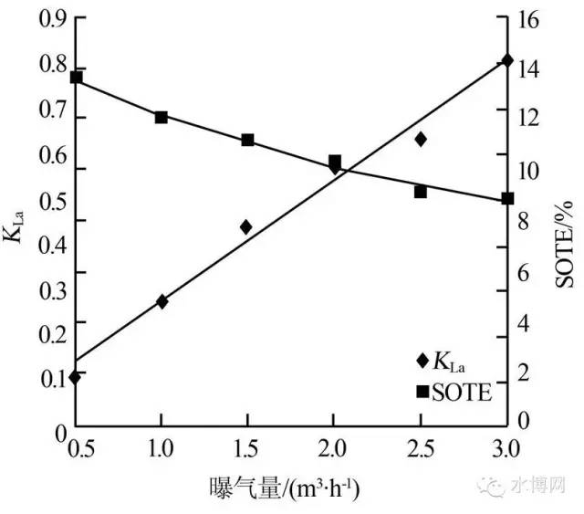 由圖2可知,KLa隨曝氣量的增加而逐漸增大。主要是因?yàn)槠貧饬吭酱?,氣液接觸面積增大,充氧效率提高。另一方面,有研究者發(fā)現(xiàn)氧利用率隨曝氣量的增加而減小,本試驗(yàn)也發(fā)現(xiàn)了類似情況。這是因?yàn)樵谝欢ㄋ钕拢貧饬枯^小時(shí)增加了氣泡在水中的停留時(shí)間,氣液接觸時(shí)間延長(zhǎng);曝氣量較大時(shí)對(duì)水體擾動(dòng)較強(qiáng),大部分氧氣未有效利用,最終以氣泡形式從水面釋放到空氣中。本試驗(yàn)得出的氧利用率與文獻(xiàn)相比不高,可能是反應(yīng)器高度不夠,大量氧氣未與水體接觸便逸出,降低了氧利用率。