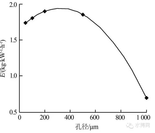 由圖5可知,理論動(dòng)力效率隨孔徑的增加呈先增大后減小的趨勢(shì)。這是因?yàn)橐环矫嫘】讖?a target="_blank" title="曝氣新聞專題">曝氣器具有較大的KLa和充氧能力,有利于充氧的進(jìn)行。另一方面,一定水深下阻力損失隨孔徑的減小而增大。當(dāng)孔徑減小對(duì)阻力損失的促進(jìn)作用大于氧傳質(zhì)作用時(shí),理論動(dòng)力效率就會(huì)隨孔徑的減小而降低。因此孔徑較小時(shí)理論動(dòng)力效率會(huì)隨孔徑增大而增大,并于孔徑200μm處達(dá)到最大值1.91kg/(kW˙h);當(dāng)孔徑>200μm時(shí),阻力損失在曝氣過(guò)程中不再起主導(dǎo)作用,KLa和充氧能力會(huì)隨著曝氣器孔徑的增加而減小,因而理論動(dòng)力效率呈明顯下降趨勢(shì)。