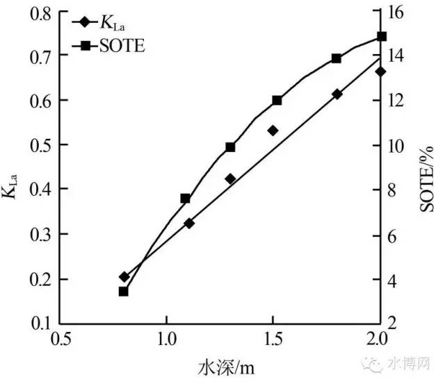 圖6表明,隨著水深的增加,KLa和氧利用率均呈明顯的增大趨勢(shì),KLa在水深0.8m處和水深2m處相差4倍多。這是因?yàn)樗钤酱?,氣泡在水體中的停留時(shí)間越長(zhǎng),氣液接觸時(shí)間就越長(zhǎng),氧傳質(zhì)效果越好。