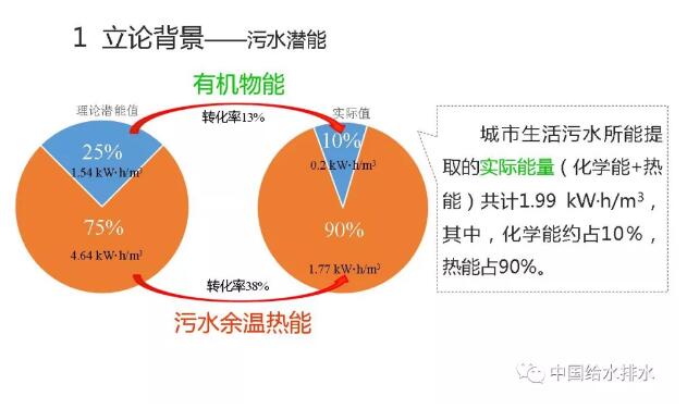 今天我的發(fā)言既與碳中和有關也跟磷回收有關。那么,關于碳中和談得是污水處理的耗能過程,有機物及氮磷去除要消耗能量,碳中和即需要從污水處理廠或污水里找到能量去彌補能耗。對此,大家更多會想到剩余污泥里有大量含能有機物,這也是我們搞污水處理人所關注的,所以,污泥厭氧消化從傳統(tǒng)到現在,以至于有更多的人前赴后繼對厭氧消化進行優(yōu)化提高其能量轉化效率,包括前處理,比如說,高碑店現在的熱水解,就是希望最大化把污泥中的有機能源轉化出來。但是,我們搞污水處理的人忽視了一個問題,就是說除了有機物形成的化學能以外,還有大量污水中的余溫熱能。請大家看這個圖,有機物中的化學能與污水中余溫熱能相比,很少、很少。理論上一個75%,一個25%。也就是說污泥中有機物的化學能只占整個污水中潛能的25%,75%是熱能。我們給大家先看這樣一個概念,也就是說我們所關注的厭氧消化轉化的能源占整個污水中的潛能,理論值是25%。那么這25%的有機能源又能轉化多少呢?顯然這是個理論值,不可能100%轉化。