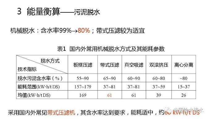 接下來我們看一下計算結果。大家知道,機械脫水有各種各樣的方法,99%~80%,這里列了很多技術與設備,我也不一一匯報了。常見的是帶式壓濾機,能達到80%含水率的要求,所以,我們就以帶式壓濾機為例進行計算,大概耗能折合成干固體每噸是60千瓦小時,即,60度電。熱干化,也就是從80%~40%,我知道搞干化設備的人有很多,到40%以后基本上就可以自持燃燒了。干化的時候輸入熱能進行蒸發(fā),所需熱量一個是用于污泥中水分升溫繼而蒸發(fā)的熱量,還有就是污泥升溫的熱量。