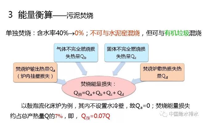 單獨焚燒,含水率40%~0%。不可與水泥窯混燒,但可與有機垃圾混燒。焚燒有熱量損失,焚燒爐輸出的熱量,比如說爐內壁掛損失、焚燒爐散熱損失等等,所有損失加在一起,以鼓泡流化床為例,大概就是7%,即占焚燒產生熱量的7%,這都是有文獻可查的。污泥焚燒也產生熱量,這個熱量主要跟有機質有關,這個是計算公式。我們國家有機質含量比較低,在30%~60%的范圍,我們計算時取污泥有機質含量中間值53%,北京大概是60%。計算污泥燃燒熱為1.2GJ/kgDS。這是不同國家污泥燃燒值,中國大概在個范圍,平均是11850kJ/kgDS。我們的計算跟這個1.185GJ/kgDS基本接近,這都是從文獻來的數據。這樣經過計算以后,污泥脫水+干化+焚燒,脫水要輸入能量,干化要輸入能量,焚燒產生能量;最后的結果會發(fā)現總耗能是3091度電每噸干固體??偖a能11.1GJ,利用熱電聯產轉換為電當量為2467度電。也就是說整個工藝的能量輸入為624度電。下面是詳細的計算表,不講了。