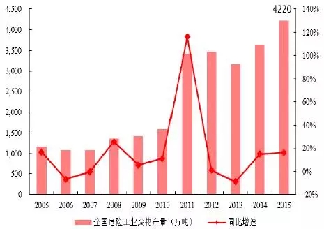 2005~2015全國危險工業(yè)廢物產(chǎn)量