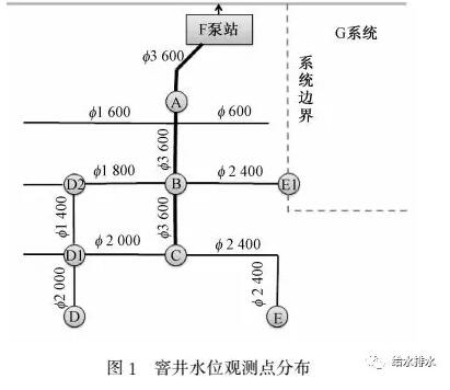 試驗(yàn)開(kāi)始前,對(duì)F調(diào)蓄池實(shí)施徹底清淤。每次試驗(yàn)時(shí),一般每隔24 h開(kāi)啟調(diào)蓄池,調(diào)蓄池蓄滿時(shí)間均在15 min左右。設(shè)計(jì)試驗(yàn)時(shí),在F泵站進(jìn)水總管、F系統(tǒng)邊界處,設(shè)置8個(gè)窨井水位觀測(cè)點(diǎn),分別為:位于總管上的A、B、C 3個(gè)點(diǎn);和B點(diǎn)直接相通的D2點(diǎn)、和B點(diǎn)直接相通且位于系統(tǒng)邊界處的E1點(diǎn);相對(duì)位于遠(yuǎn)端的、類似于進(jìn)水管“肩膀”處的D、E、D1等3個(gè)點(diǎn),詳見(jiàn)圖1。