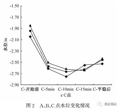 試驗(yàn)發(fā)現(xiàn),A、B、C、D2、E1等5個(gè)點(diǎn)的水位,會(huì)隨F調(diào)蓄池進(jìn)水至蓄滿而呈U型狀變化,以A、B、C為例(見(jiàn)圖2),基本都在10~15 min時(shí)水位變化最為明顯。但位于遠(yuǎn)端的D、E、D1等3個(gè)點(diǎn)幾乎未發(fā)生變化。由此可以初步判斷,F(xiàn)調(diào)蓄池對(duì)進(jìn)水總管的拉動(dòng),至C點(diǎn)結(jié)束,總長(zhǎng)約1 200 m;調(diào)蓄池的運(yùn)行,僅對(duì)鄰近的管網(wǎng)起到了收水效果。