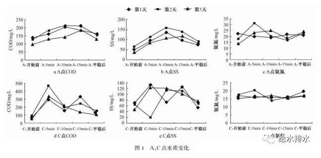 更值得注意的是A、B、C、D2、E1這5個(gè)點(diǎn)的水質(zhì)變化,以A、C兩點(diǎn)為例(見(jiàn)圖4),在15 min的進(jìn)水過(guò)程中,隨著水位突降,COD和SS呈現(xiàn)出一個(gè)突增趨勢(shì),氨氮卻相對(duì)平穩(wěn)。同時(shí),調(diào)蓄池內(nèi)的水質(zhì)也大致如此,COD和SS在最后一天時(shí)達(dá)到最大值,而氨氮卻總體穩(wěn)定。