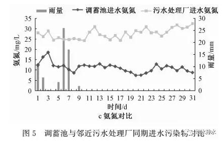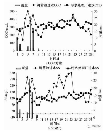 汛后試驗(yàn)的水質(zhì)監(jiān)測(cè)對(duì)象是調(diào)蓄池進(jìn)水,將其與同期污水處理廠進(jìn)水水質(zhì)比較,結(jié)果見(jiàn)圖5。