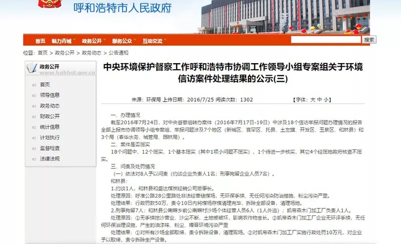 在呼和浩特市人民政府網(wǎng)站的政務(wù)公開一欄中,督察人員查閱到標(biāo)題為《中央環(huán)境保護(hù)督察工作呼和浩特市協(xié)調(diào)工作領(lǐng)導(dǎo)小組專案組關(guān)于環(huán)境信訪案件處理結(jié)果的公示(三)》的網(wǎng)頁,其中清楚地顯示對凱帝森木門加工廠的問責(zé)及處罰情況?!皠P帝森木門加工廠企業(yè)無環(huán)評手續(xù),無任何環(huán)保治理設(shè)施,產(chǎn)生的油漆味、粉塵、噪音環(huán)境污染嚴(yán)重”。處理結(jié)果是“對凱帝森木門加工廠實(shí)施行政處罰10萬元,對企業(yè)予以取締,責(zé)令拆除生產(chǎn)設(shè)備”。