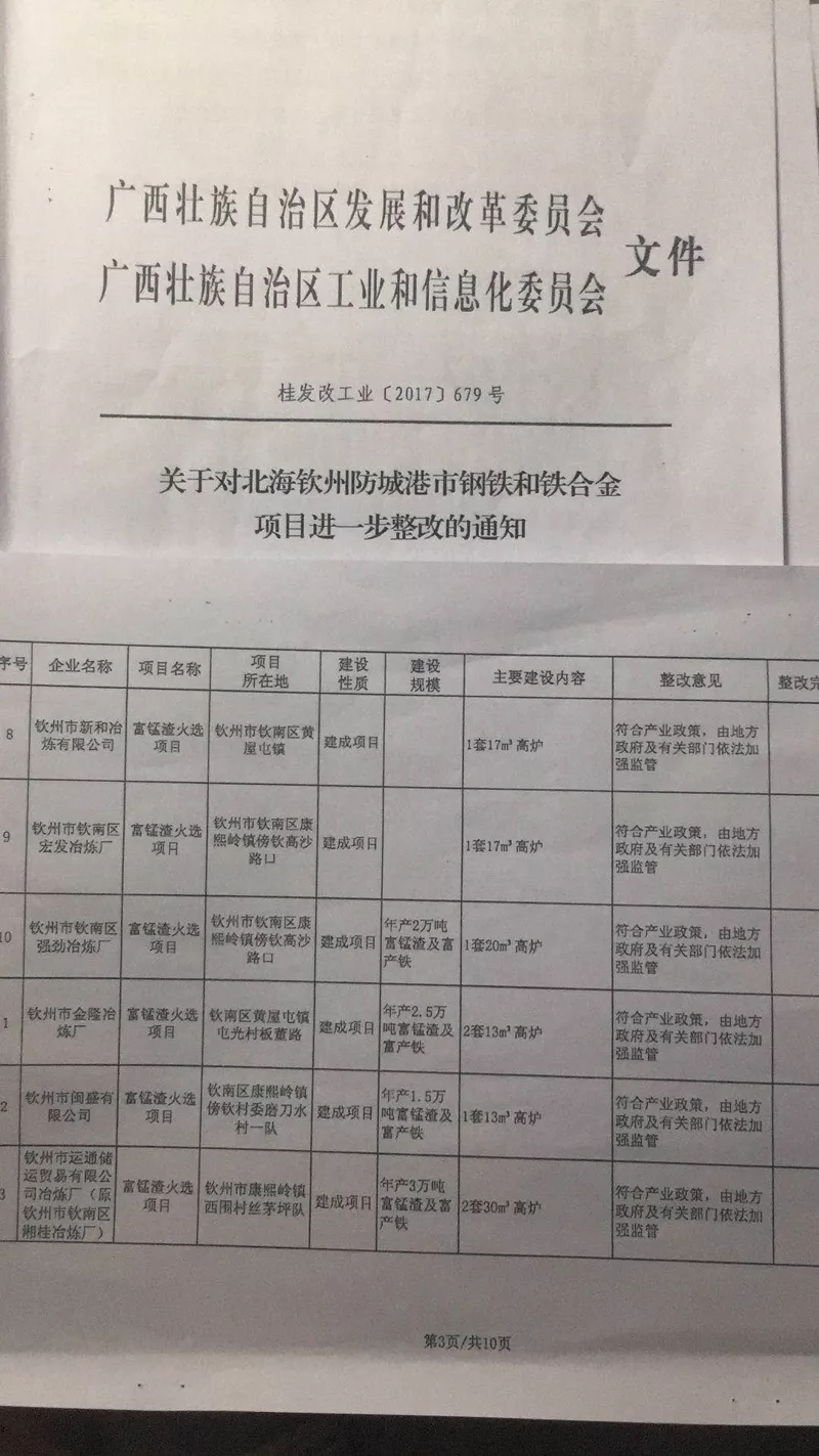 根據(jù)《產(chǎn)業(yè)結(jié)構(gòu)調(diào)整指導(dǎo)目錄(2011年本)(修正)》,100立方米及以下鐵合金錳鐵高爐屬于淘汰類落后工藝裝備。但自治區(qū)發(fā)改委、工信委及欽州市有關(guān)部門以富錳渣不屬于錳鐵合金為由,不僅沒有嚴(yán)格把關(guān),而且層層“放水”。自治區(qū)發(fā)改委、工信委2017年6月1日聯(lián)合印發(fā)《關(guān)于對北海欽州防城港市鋼鐵和鐵合金項(xiàng)目進(jìn)一步整改的通知》,認(rèn)定欽州市23個(gè)使用13-50立方米高爐冶煉項(xiàng)目符合產(chǎn)業(yè)政策,其中5個(gè)項(xiàng)目生產(chǎn)設(shè)備實(shí)際于2013年前就已拆除。