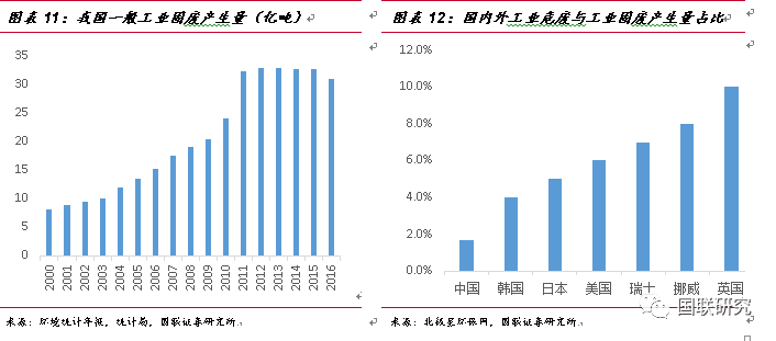②第二產(chǎn)業(yè)增加值測(cè)算法:由于危廢排放的企業(yè)多數(shù)來(lái)自于化工、有色等中游制造企業(yè),我們認(rèn)為危廢的實(shí)際產(chǎn)生量將與第二產(chǎn)業(yè)的景氣度是呈現(xiàn)正相關(guān)性。2007年至2016年,我國(guó)第二產(chǎn)業(yè)的增加值由11.58萬(wàn)億元增長(zhǎng)到29.65萬(wàn)億元,復(fù)合增長(zhǎng)率達(dá)9.91%,2007年污染源第一次普查時(shí)危廢實(shí)際產(chǎn)量為4573萬(wàn)噸,在默認(rèn)普查數(shù)據(jù)為準(zhǔn)確數(shù)據(jù)的情況下,按照9.91%的危廢增長(zhǎng)速率進(jìn)行測(cè)算,2016年我國(guó)危廢實(shí)際產(chǎn)生量將達(dá)到1.07億噸。