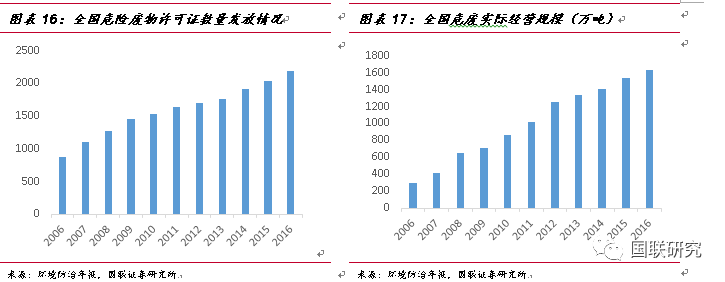 在一系列環(huán)保政策的刺激下,危廢處置行業(yè)需求將逐步迎來(lái)有效釋放。根據(jù)《2017年全國(guó)大、中城市固體廢物污染環(huán)境防治年報(bào)》統(tǒng)計(jì)數(shù)據(jù)顯示,截至2016年底,全國(guó)各省(區(qū)、市)頒發(fā)的危廢(包含醫(yī)療廢物)經(jīng)營(yíng)許可證共計(jì)2195份,核準(zhǔn)經(jīng)營(yíng)規(guī)模為6471萬(wàn)噸/年(含收集經(jīng)營(yíng)規(guī)模397萬(wàn)噸/年)。而根據(jù)環(huán)境防治年報(bào),2016年實(shí)際經(jīng)營(yíng)規(guī)模為1629萬(wàn)噸(含收集23萬(wàn)噸),有效處理能力較低,大量的產(chǎn)能仍未完全釋放。