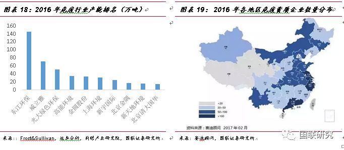 行業(yè)集中度低、規(guī)模小,公司處于絕對(duì)領(lǐng)先地位。我國(guó)的危廢行業(yè)的市場(chǎng)參與者眾多,但是具有規(guī)模效應(yīng)的企業(yè)很少,目前我國(guó)危廢行業(yè)呈現(xiàn)出的特征主要有以下幾點(diǎn):①行業(yè)集中度低:根據(jù)Frost&Sullivan、遠(yuǎn)卓分析、前瞻產(chǎn)業(yè)研究院的統(tǒng)計(jì)數(shù)據(jù),截止 2016 年,行業(yè)內(nèi)排名前十大公司僅占總設(shè)計(jì)處置能力的6.8%,其中東江環(huán)保市占率為2.26%,處絕對(duì)領(lǐng)先地位;②危險(xiǎn)廢物產(chǎn)生量與處理能力分布不匹配。2016年我國(guó)持危險(xiǎn)廢棄物經(jīng)營(yíng)許可證的企業(yè)數(shù)量為2149家,主要集中于長(zhǎng)三角和珠三角區(qū)域,欠發(fā)達(dá)地區(qū)許可證數(shù)量少。其中江蘇、浙江和廣東三省資質(zhì)企業(yè)數(shù)量共計(jì)503家,占全國(guó)總數(shù)的30%以上。根據(jù)Frost&Sullivan的數(shù)據(jù),2015年危險(xiǎn)廢物產(chǎn)生量主要集中在東部、西北部、中部,分別占總產(chǎn)生量的31%、24%,13%,可以看出華東地區(qū)及西北地區(qū)占危險(xiǎn)廢物產(chǎn)生量的大部分。而經(jīng)濟(jì)發(fā)達(dá)地區(qū)如華東及華南占危險(xiǎn)廢物處理能力的大部分。危廢處置行業(yè)中,東江環(huán)保、光大國(guó)際、威立雅中國(guó)、新宇國(guó)際等企業(yè)進(jìn)入行業(yè)較早,經(jīng)過(guò)多年的發(fā)展已經(jīng)具備規(guī)模和產(chǎn)能優(yōu)勢(shì),而且位于危廢產(chǎn)生量較大的省份,有較強(qiáng)的客戶資源和競(jìng)爭(zhēng)優(yōu)勢(shì)。③經(jīng)營(yíng)企業(yè)規(guī)模小、處理能力弱。按照2016年核準(zhǔn)經(jīng)營(yíng)規(guī)模和企業(yè)數(shù)量的數(shù)據(jù)測(cè)算,平均每家的核準(zhǔn)處理能力僅為3萬(wàn)噸/年,并且大部分企業(yè)技術(shù)、資金等實(shí)力較弱,日均處理能力超過(guò)50噸的企業(yè)占比不到20%,達(dá)到1000噸的僅占0.3%,并且能夠處理25種以上危廢種類的企業(yè)僅為1%,絕大多數(shù)均小于10種。在2017年,東江環(huán)保已具備44類危險(xiǎn)廢物經(jīng)營(yíng)資質(zhì),在危廢行業(yè)中處于絕對(duì)領(lǐng)先地位。