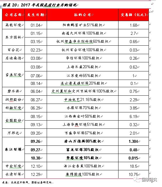 行業(yè)并購(gòu)熱度高,進(jìn)入群雄逐鹿時(shí)代。在過(guò)去的2017年,我國(guó)危廢行業(yè)兼并購(gòu)市場(chǎng)火爆,整個(gè)環(huán)保產(chǎn)業(yè)共發(fā)生86起并購(gòu),交易金額達(dá)385億元,交易金額與數(shù)量均創(chuàng)新高,其中涉及到危廢的并購(gòu)市場(chǎng)達(dá)20余起。