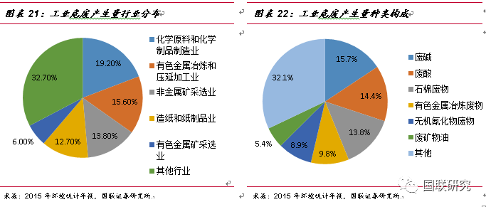 工業(yè)危廢的主要來(lái)源及種類構(gòu)成。鑒于對(duì)危險(xiǎn)廢物的認(rèn)識(shí)不斷深入,在2016年6月21日,生態(tài)環(huán)境部重新修訂了《國(guó)家危險(xiǎn)廢物名錄》,將危廢由49大類重新調(diào)整為46大類,新增117種類別,共計(jì)479種,而其中70%以上的危廢都來(lái)自于工業(yè)行業(yè)。據(jù)2015年環(huán)境統(tǒng)計(jì)年報(bào)數(shù)據(jù)統(tǒng)計(jì),工業(yè)危廢中產(chǎn)量最大的行業(yè)分別為化學(xué)原料與化學(xué)制品制造業(yè)(占比19.2%)、有色金屬冶煉和壓延加工(占比15.6%)、非金屬礦采選業(yè)(占比13.8%)以及造紙和紙制品業(yè)(占比12.7%)。