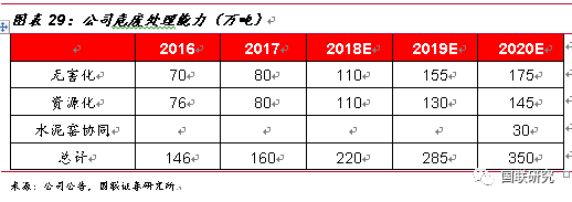 公司始終專注于危險(xiǎn)廢物的無(wú)害化處理及資源化利用,憑借自身突出的技術(shù)優(yōu)勢(shì)、資深的管理經(jīng)驗(yàn)以及資本優(yōu)勢(shì)等,公司在危廢處理行業(yè)持續(xù)鞏固龍頭運(yùn)營(yíng)商的地位。截至2017年,公司擁有工業(yè)危險(xiǎn)廢物處理資質(zhì)達(dá)160萬(wàn)噸/年,在行業(yè)內(nèi)遙遙領(lǐng)先。按照公司未來(lái)幾年規(guī)劃產(chǎn)能,2020年預(yù)計(jì)公司將擁有350萬(wàn)噸/年的綜合治理產(chǎn)能,包括水泥窯協(xié)同處置產(chǎn)能,CAGR達(dá)29.81%。對(duì)比我們上文對(duì)公司未來(lái)產(chǎn)能空間的測(cè)算,假設(shè)市占率2.26%保持不變,公司預(yù)期產(chǎn)能352.8萬(wàn)噸,所以我們判斷公司規(guī)劃的產(chǎn)能實(shí)現(xiàn)概率很高。