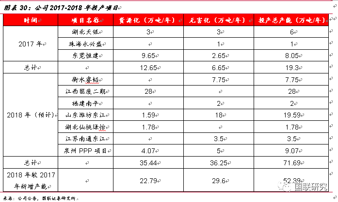 大量項(xiàng)目即將落地投產(chǎn),危廢處理能力持續(xù)增強(qiáng)。根據(jù)公司2017年年報(bào)披露數(shù)據(jù),2017年公司共建成項(xiàng)目有湖北天銀(無(wú)害化3萬(wàn)噸/年,資源化3萬(wàn)噸/年)、珠海永興盛(無(wú)害化1萬(wàn)噸/年)、東莞恒建(無(wú)害化2.65萬(wàn)噸/年、資源化9.65萬(wàn)噸/年),2017年新增總產(chǎn)能達(dá)19.3萬(wàn)噸/年。2018年預(yù)計(jì)能夠投產(chǎn)的項(xiàng)目包括衡水睿稻(無(wú)害化7.75萬(wàn)噸/年)、江西固廢二期(資源化28萬(wàn)噸/年)、福建南平(無(wú)害化2萬(wàn)噸/年)、山東濰坊東江(無(wú)害化1.59萬(wàn)噸/年,資源化18萬(wàn)噸/年)、湖北仙桃綠怡(資源化1.78萬(wàn)噸/年)、江蘇南通(無(wú)害化3.5萬(wàn)噸/年)、泉州PPP項(xiàng)目(無(wú)害化5萬(wàn)噸/年、資源化4.07萬(wàn)噸/年),2018年預(yù)計(jì)總產(chǎn)能達(dá)71.69萬(wàn)噸/年。