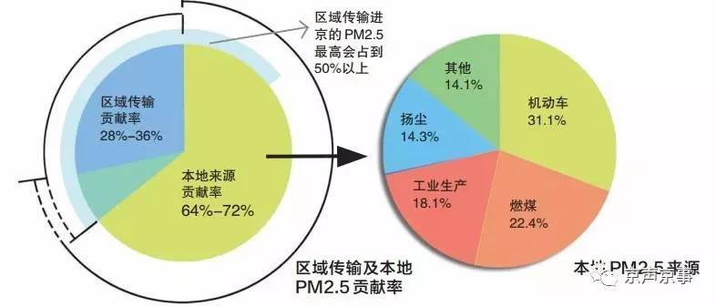 2014年4月,北京正式發(fā)布PM2.5來源解析最新研究成果:全年P(guān)M2.5來源中,區(qū)域傳輸貢獻(xiàn)約占28%至36%,本地污染排放貢獻(xiàn)占64%至72%。在本地污染貢獻(xiàn)中,機(jī)動(dòng)車排放比例最高,達(dá)31.1%。一些特定空氣重污染過程中,通過區(qū)域傳輸進(jìn)京的PM2.5會(huì)占到總量的50%以上。