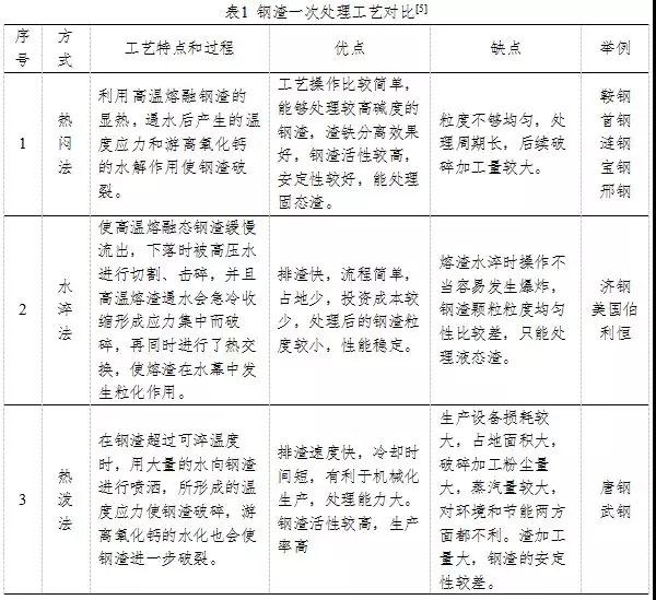 鋼渣的一次處理是把熱熔渣處理成粒徑符合一定要求的常溫塊渣,以有利于鋼渣的二次處理。目前國內(nèi)鋼渣一次處理主要工藝有:熱潑法、風(fēng)淬法、滾筒法、粒化輪法、熱悶法等,其中熱潑法、滾筒法、熱悶法最為常用。表1綜合比較了各種工藝的特點。