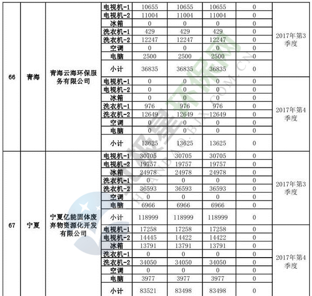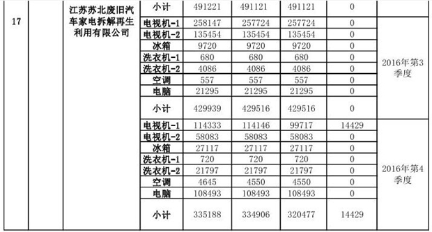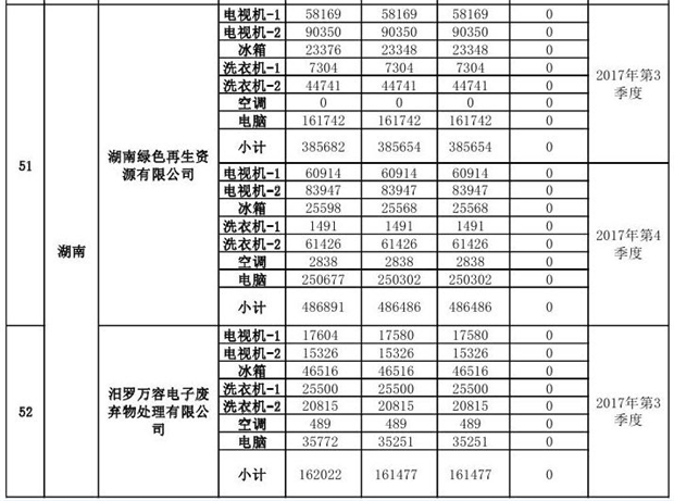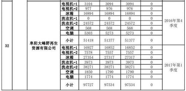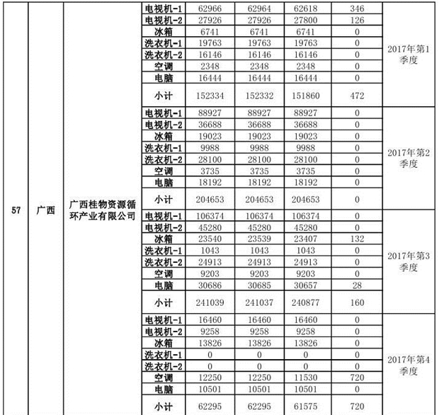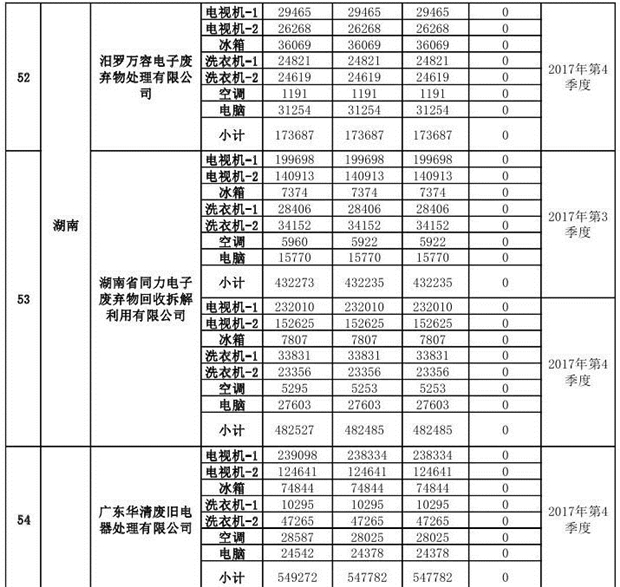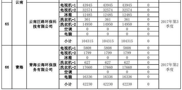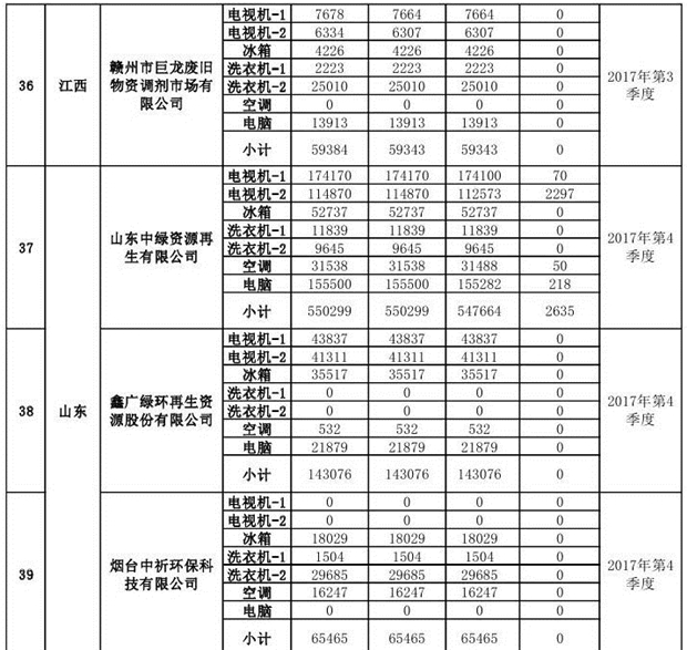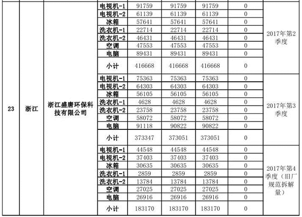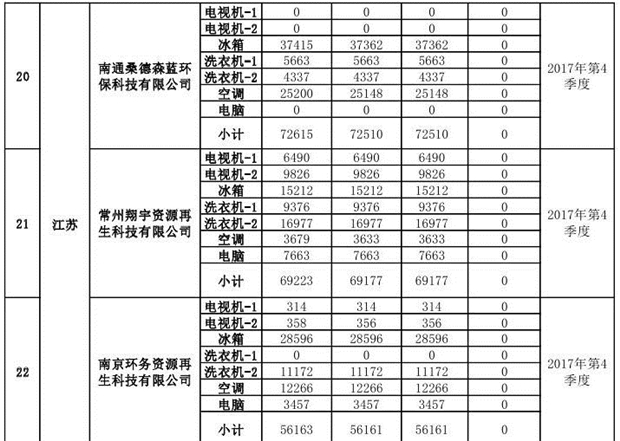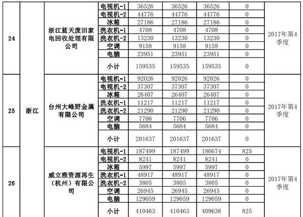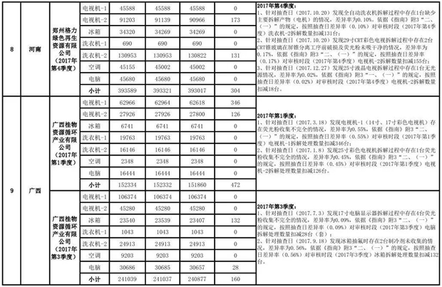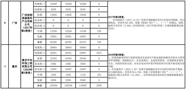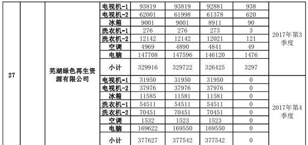 上述69家通過技術(shù)復(fù)核的企業(yè)申請廢電器規(guī)范拆解處理數(shù)量為26342953 臺(套);經(jīng)省級環(huán)保部門審核認(rèn)定廢電器規(guī)范拆解處理數(shù)量為26306765臺(套),扣減36188臺(套);部固管中心通過技術(shù)復(fù)核擬確認(rèn)廢電器規(guī)范拆解處理數(shù)量為26242476臺(套),扣減64289臺(套)(詳見附件)。