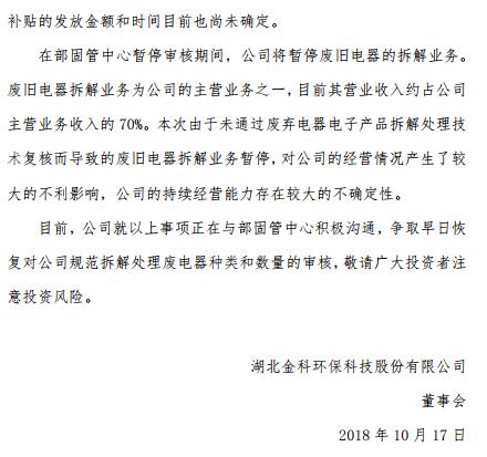 10月17日,金科環(huán)保發(fā)布公告稱,公司主營業(yè)務(wù)廢舊電器拆解業(yè)務(wù)因未通過2018 年第二批次廢棄電器電子產(chǎn)品拆解處理技術(shù)復(fù)核,已暫停工作,該業(yè)務(wù)營收約占公司主營業(yè)務(wù)營收的70%,預(yù)計將對金科環(huán)保的經(jīng)營情況產(chǎn)生較大的不利影響。