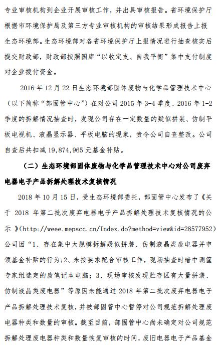 公告顯示,金科環(huán)保廢舊電器拆解業(yè)務(wù)未通過審核的原因在于:1、存在集中大規(guī)模拆解疑似拼裝、仿制液晶類廢電器并申領(lǐng)基金補貼的行為;2、未按要求配合審核工作,現(xiàn)場抽查時暗中調(diào)筐專家組選定的廢筆記本電腦;3、現(xiàn)場審核發(fā)現(xiàn)貯存區(qū)有大量拼裝、仿制液晶類廢電器。