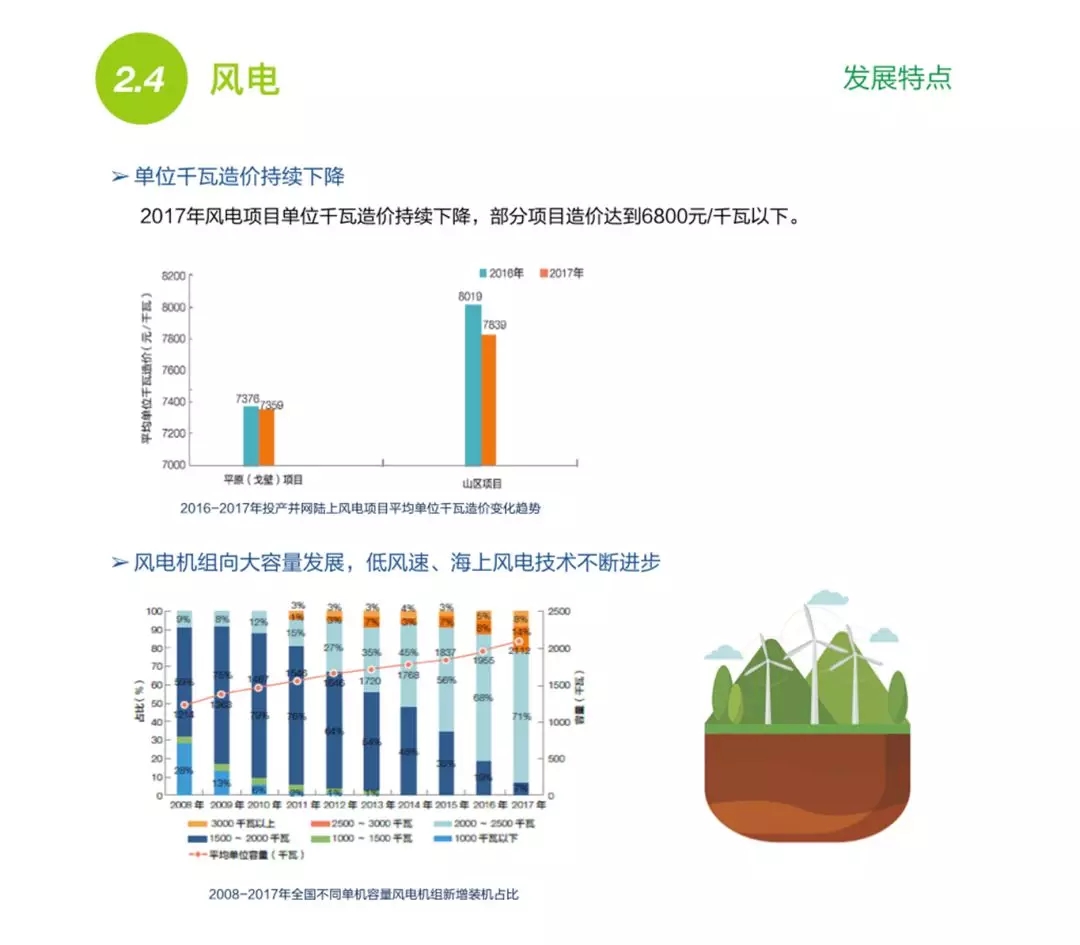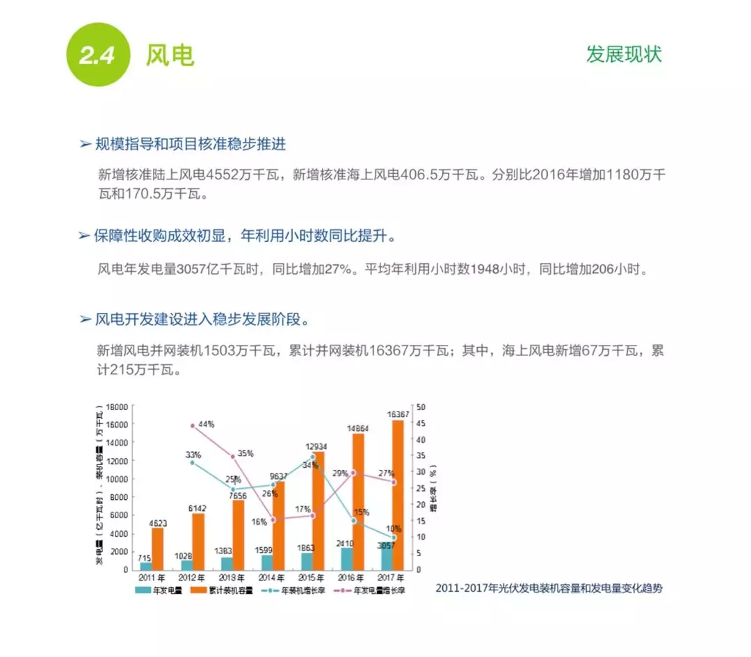 在風(fēng)電方面,去年我國核準(zhǔn)的陸上風(fēng)電和海上風(fēng)電達(dá)4958萬千瓦,2017年投產(chǎn)風(fēng)電達(dá)到了1503萬千瓦,累計(jì)并網(wǎng)裝機(jī)容量1.64億千瓦。棄風(fēng)現(xiàn)象得到了有效控制,風(fēng)電單位千瓦造價持續(xù)下降,2017年部分項(xiàng)目的造價已經(jīng)低于每千瓦6800元。