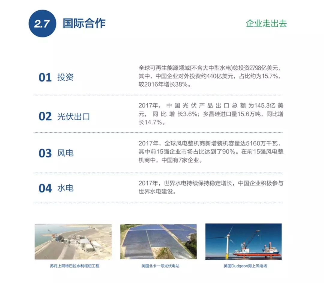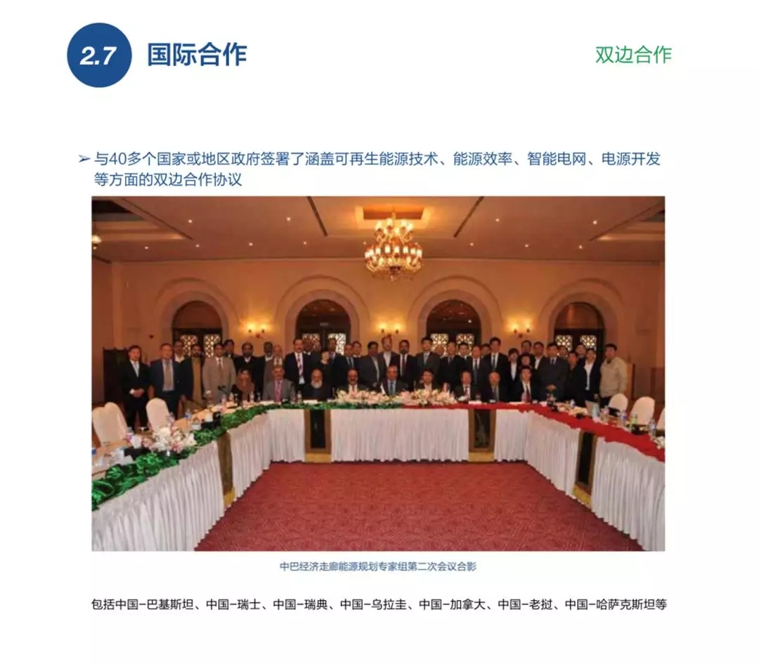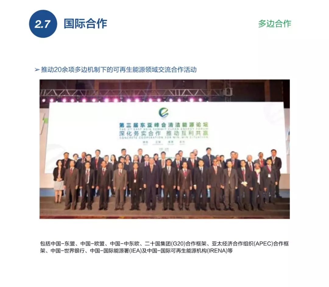 國際合作方面,去年國家能源局推動了20余項(xiàng)多邊機(jī)制下可再生能源的領(lǐng)域交流互動,同時與40多個國家和地方政府簽署涵蓋可再生能源技術(shù)、能源效率、智能電網(wǎng)、電源開發(fā)等方面的雙邊合作協(xié)議。