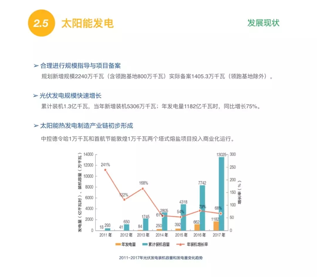 在太陽能發(fā)電方面,去年我國新增裝機(jī)5306萬千瓦,目前我國光伏發(fā)電累計(jì)裝機(jī)已達(dá)1.3億千瓦。同時,我國太陽能熱發(fā)電制造產(chǎn)業(yè)鏈也初步形成。2017年太陽光伏發(fā)電投資規(guī)模快速增長,比2016年增長了41%,同時單位千瓦造價部分已經(jīng)降低至每千瓦5500元以下,棄光的現(xiàn)象也得到了有效控制。