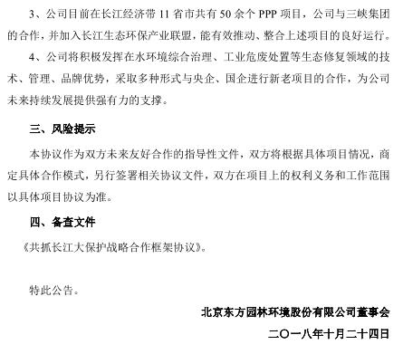 10月24日,東方園林公告,公司與長(zhǎng)江三峽集團(tuán)簽訂《共抓長(zhǎng)江大保護(hù)戰(zhàn)略合作框架協(xié)議》,雙方將通過(guò)多種合作模式,推動(dòng)長(zhǎng)江經(jīng)濟(jì)帶綠色產(chǎn)業(yè)經(jīng)濟(jì)運(yùn)營(yíng)合作;目前東方園林在長(zhǎng)江經(jīng)濟(jì)帶11省市共有50余個(gè)PPP項(xiàng)目,與三峽集團(tuán)合作,并加入長(zhǎng)江生態(tài)環(huán)保產(chǎn)業(yè)聯(lián)盟,能有效推動(dòng)這些項(xiàng)目的良好運(yùn)行。