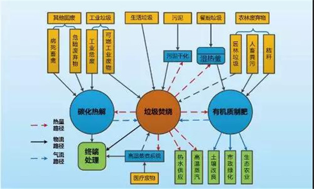 圍繞城市固廢的協(xié)同處置,徐工推出了“以廢治廢”的工藝處理方案,建設(shè)綜合循環(huán)產(chǎn)業(yè)園。以城市垃圾清潔焚燒為基礎(chǔ),利用產(chǎn)生的熱能用于有機廢物的資源化利用、危險廢物的無氧碳化處理,并將處理過程中產(chǎn)生的臭氣、污水等物質(zhì)引入到焚燒系統(tǒng),實現(xiàn)了能量的階梯利用和固體廢物的循環(huán)處理。