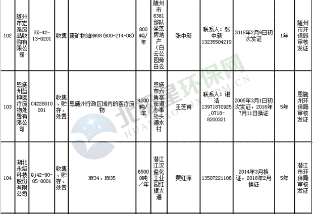 日前湖北省環(huán)保廳發(fā)布了《湖北省危險(xiǎn)廢物經(jīng)營(yíng)許可證》單位名錄(截至2018年10月12日,共108家),且附有聯(lián)系電話,具體內(nèi)容如下: