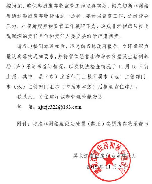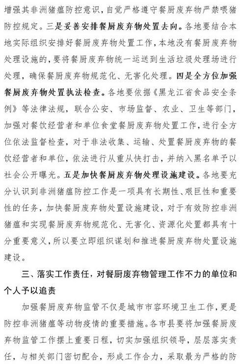 日前,黑龍江住建廳發(fā)布了關(guān)于防控非洲豬瘟加強(qiáng)餐廚廢棄物管理工作的緊急通知,《通知》指出,目前,全國(guó)和我省非洲豬瘟防控工作形勢(shì)十分嚴(yán)峻。國(guó)際非洲豬瘟防控實(shí)踐表明,餐廚廢棄物喂豬是非洲豬瘟傳播的重要途徑之一。各地要杜絕泔水喂豬,依據(jù)《黑龍江省食品安全條例》,建立健全餐廚廢棄物監(jiān)管機(jī)制,將餐飲經(jīng)營(yíng)者和單位食堂納入全面監(jiān)管范圍,與其負(fù)責(zé)人逐一簽訂承諾書(shū),并建立餐廚廢棄物產(chǎn)生、收集、運(yùn)輸、處理臺(tái)賬,實(shí)現(xiàn)底數(shù)清、情況明、去向可控。全面禁止生豬飼養(yǎng)場(chǎng)(戶(hù))接收餐廚廢棄物。