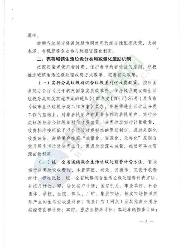 在積極推進(jìn)生活垃圾分類工作的基礎(chǔ)上,對非居民用戶和具備條件的居民用戶,實(shí)行分類垃圾與混合垃圾差別化收費(fèi)政策。分類垃圾實(shí)行計(jì)量收費(fèi),收費(fèi)標(biāo)準(zhǔn)按照低于混合垃圾收費(fèi)標(biāo)準(zhǔn)的原則制定。通過差別化收費(fèi)政策,激勵(lì)用戶按照“減量化、資源化、無害化”原則自覺開展生活垃圾分類工作,促進(jìn)垃圾源頭減量,推動(dòng)可再生資源回收利用。暫未實(shí)行分類垃圾收費(fèi)的,統(tǒng)一全省城鎮(zhèn)混合生活垃圾處理費(fèi)計(jì)費(fèi)方法,并按月征收。即:居民按戶計(jì)征;國家機(jī)關(guān)、事業(yè)單位、社會(huì)團(tuán)體、學(xué)校、醫(yī)院、部隊(duì)、廠礦、集貿(mào)市場、批發(fā)市場按照實(shí)際產(chǎn)生的生活垃圾量計(jì)征;商業(yè)門店(網(wǎng)點(diǎn))及其他商業(yè)用房按經(jīng)營面積計(jì)征;賓館、旅店業(yè)按床計(jì)征;客運(yùn)車輛按座計(jì)征;餐廚垃圾按照實(shí)際產(chǎn)生量計(jì)征;其他產(chǎn)生生活垃圾的單位和個(gè)人按照定額或計(jì)量的方式計(jì)征。