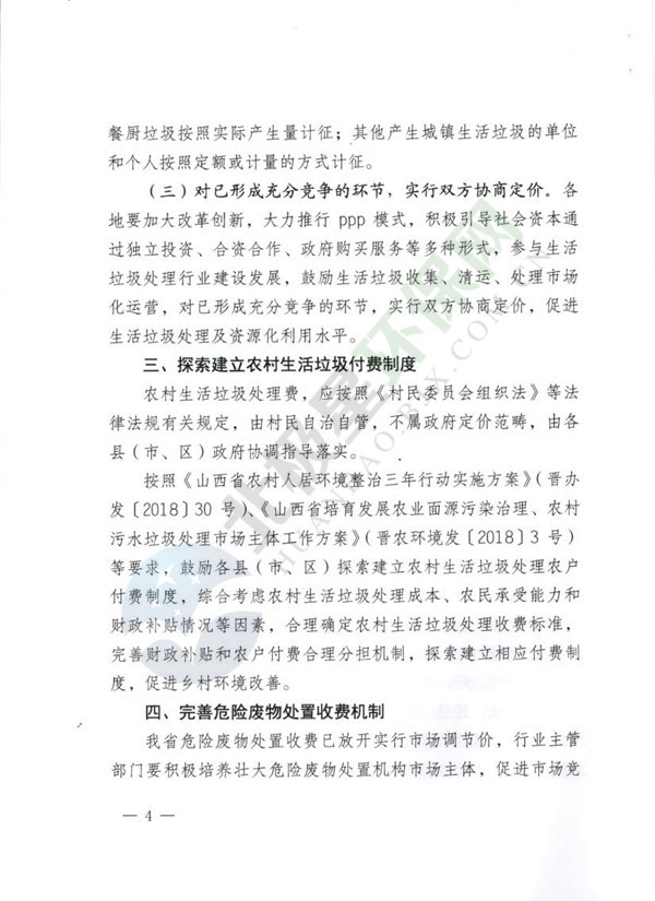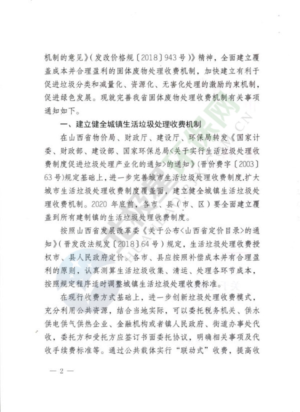 日前山西省發(fā)展和改革委員會(huì)、山西省財(cái)政廳、山西省住房和城鄉(xiāng)建設(shè)廳、山西省生態(tài)環(huán)境廳、山西省衛(wèi)生健康委員會(huì)聯(lián)合下發(fā)《關(guān)于完善固體廢物處理收費(fèi)機(jī)制的通知》,明確提出按照污染者使用者付費(fèi)、保護(hù)者節(jié)約者受益的原則,積極推進(jìn)城鎮(zhèn)生活垃圾處理收費(fèi)方式改革。