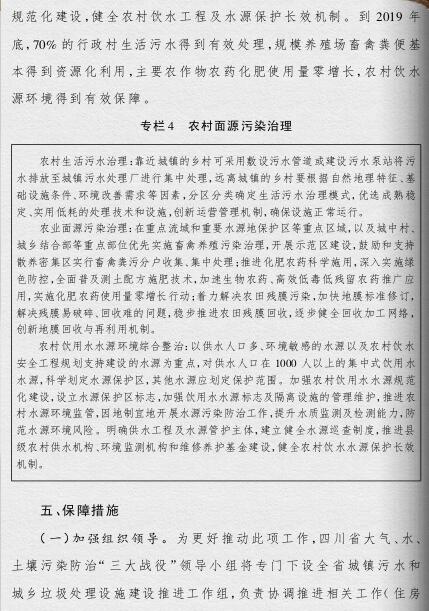 四川省政府印發(fā)了《四川省城鎮(zhèn)污水處理設(shè)施建設(shè)三年推進(jìn)方案》?!斗桨浮诽岢?,今年成都市建成區(qū)要全部消除黑臭水體,到2019年,全省城鎮(zhèn)基本具備污水收集能力,地級(jí)及以上城市建成區(qū)黑臭水體比例控制在10%以內(nèi),全面實(shí)現(xiàn)城鎮(zhèn)污水處理設(shè)施運(yùn)行規(guī)范化和監(jiān)管信息化,實(shí)現(xiàn)超標(biāo)工業(yè)廢水零排放,70%的行政村生活污水得到有效處理。