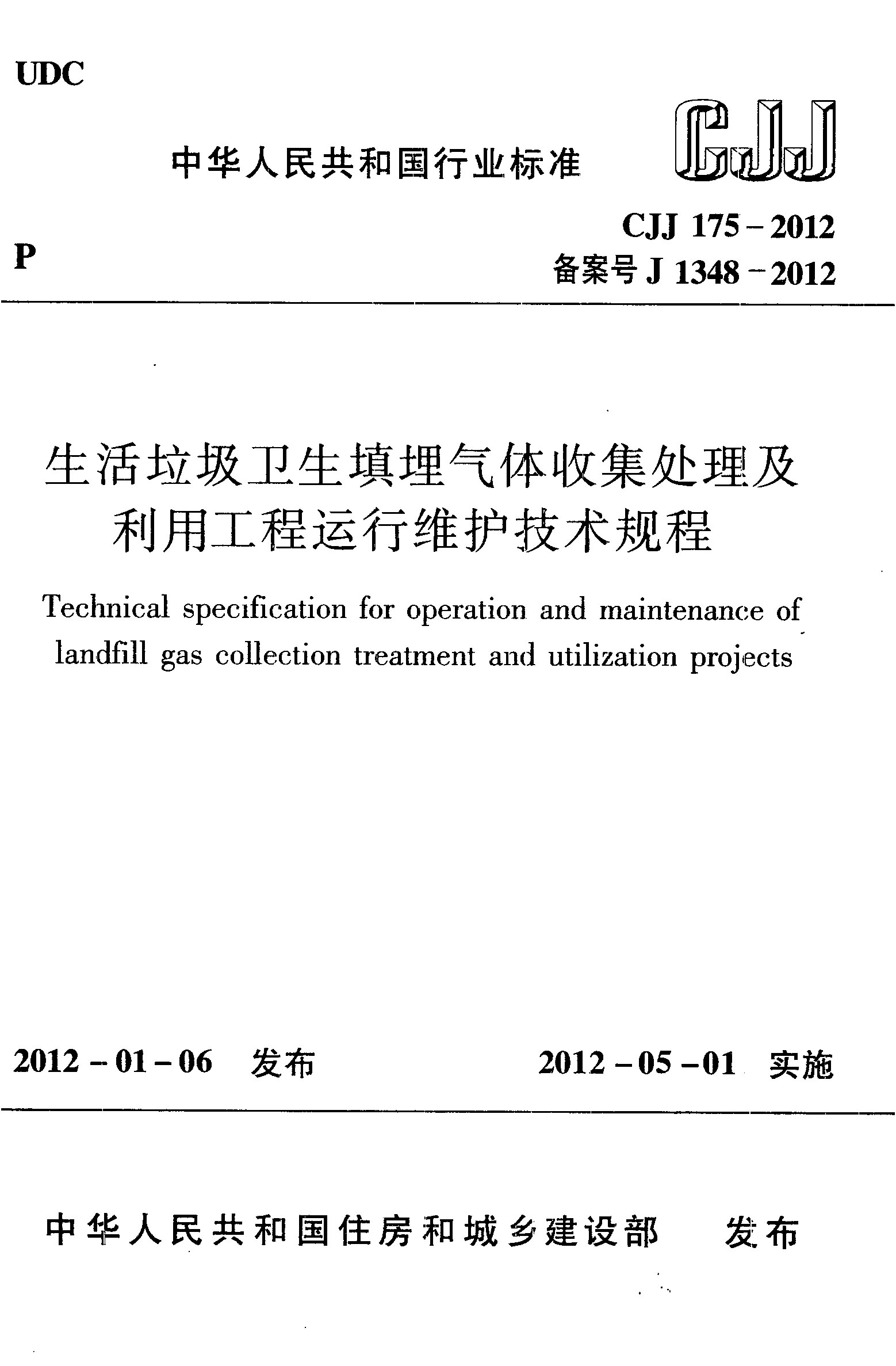 生活垃圾衛(wèi)生填埋氣體收集處理及利用工程運(yùn)行維護(hù)技術(shù)規(guī)程(CJJ/T 175-2012)