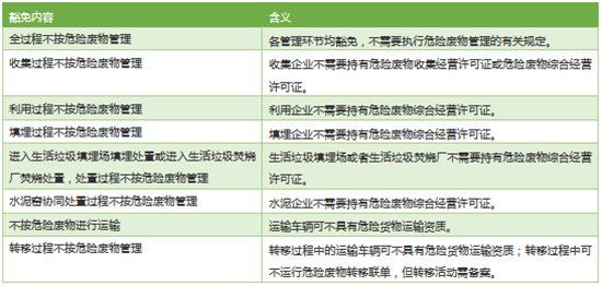 豁免環(huán)節(jié)包括收集、處置、利用、運(yùn)輸、轉(zhuǎn)移以及全過(guò)程6類(lèi)。