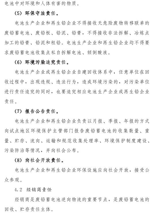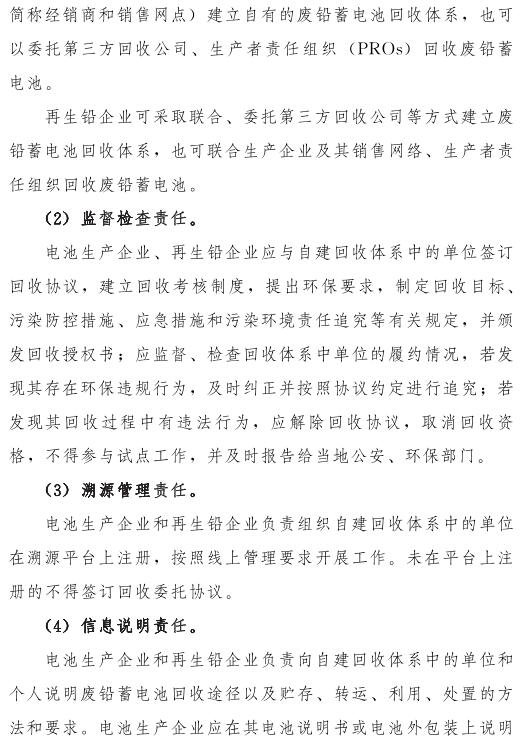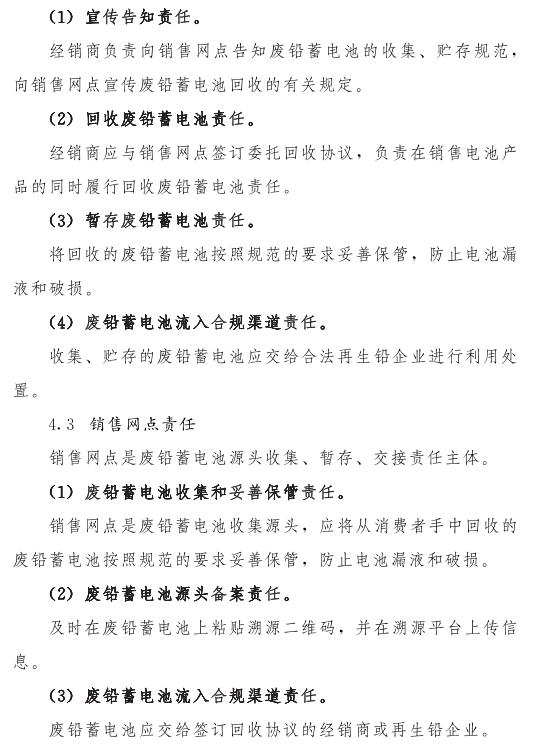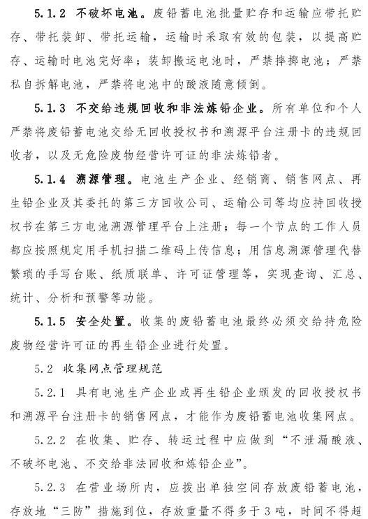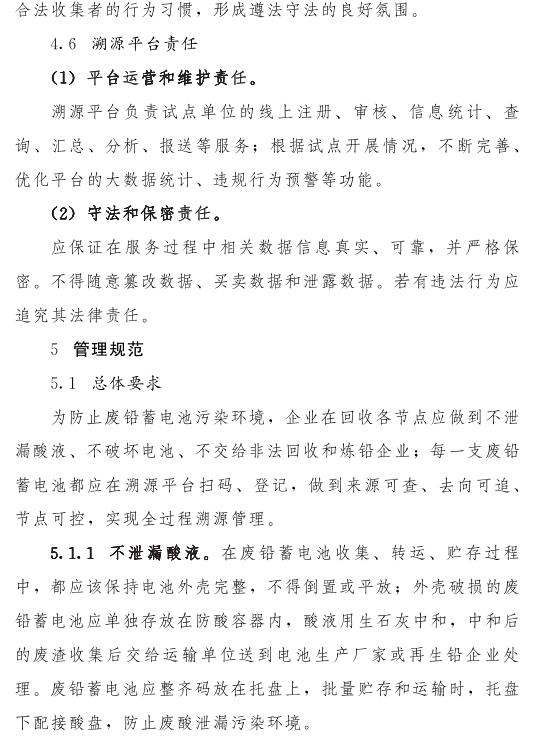 推動(dòng)落實(shí)生產(chǎn)者責(zé)任延伸制度,由鉛蓄電池生產(chǎn)企業(yè)依托自有銷(xiāo)售渠道建立廢鉛蓄電池逆向物流回收體系,持危險(xiǎn)廢物經(jīng)營(yíng)許可證的再生鉛企業(yè)可通過(guò)自主回收、聯(lián)合回收或委托回收等方式建立回收體系。鼓勵(lì)生產(chǎn)企業(yè)和持證企業(yè)進(jìn)行信息溝通和密切合作,以市場(chǎng)為導(dǎo)向,建立穩(wěn)定的商業(yè)交易模式,并采取以舊換新等措施,不斷提高收集處理率。各回收體系收集的廢鉛蓄電池最終須交由具有危險(xiǎn)廢物經(jīng)營(yíng)許可證的再生鉛企業(yè)利用處置。制定 《廢鉛蓄電池規(guī)范化管理指南》,明確回收體系中各環(huán)節(jié)、各責(zé)任主體責(zé)任及廢鉛蓄電池管理規(guī)范。參與廢鉛蓄電池回收的各責(zé)任主體須嚴(yán)格遵守 《廢鉛蓄電池規(guī)范化管理指南》的各項(xiàng)規(guī)定。