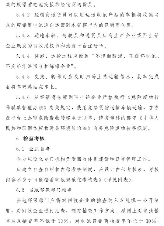 在試點(diǎn)市范圍內(nèi),廢鉛蓄電池在收集網(wǎng)點(diǎn)和經(jīng)銷(xiāo)商倉(cāng)庫(kù)之間轉(zhuǎn)移,可使用鉛蓄電池貨物運(yùn)輸車(chē)輛轉(zhuǎn)運(yùn),廢鉛蓄電池自經(jīng)銷(xiāo)商轉(zhuǎn)運(yùn)至持危險(xiǎn)廢物許可證的再生鉛企業(yè)、工業(yè)企業(yè)產(chǎn)生的廢鉛蓄電池集中轉(zhuǎn)運(yùn)的,按照危險(xiǎn)廢物進(jìn)行管理,運(yùn)行危險(xiǎn)廢物轉(zhuǎn)移聯(lián)單,遵守危險(xiǎn)貨物運(yùn)輸管理有關(guān)規(guī)定??缡∞D(zhuǎn)移廢鉛蓄電池的,應(yīng)當(dāng)經(jīng)移出地和移入地省級(jí)環(huán)保部門(mén)批準(zhǔn)。