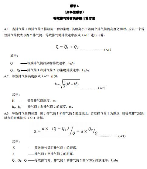 4.3.3兩個排放相同污染物的排氣筒,若其距離小于其幾何高度之和,應(yīng)合并并視為一根等效排氣筒。有三根以上的近距離排氣筒,且排放同一種污染物,應(yīng)以前兩根的等效排氣筒,依次與第三、第四根排氣筒取等效值。三根以上排氣筒計算等效高度時,應(yīng)選取不同等效順序計算的等效高度值中的最小值作為等效排氣筒高度。等效排氣筒有關(guān)參數(shù)的計算公式參見附錄B。